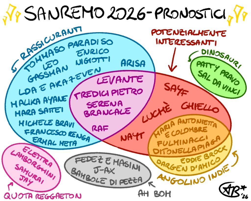 (come, signor Google? Volevi un paragrafo introduttivo SEO-friendly? Ma è Sanremo, perbacco — anzi, per Bacco, ché per sopravvivere a ‘sta roba mi servono almeno due bottiglie-)